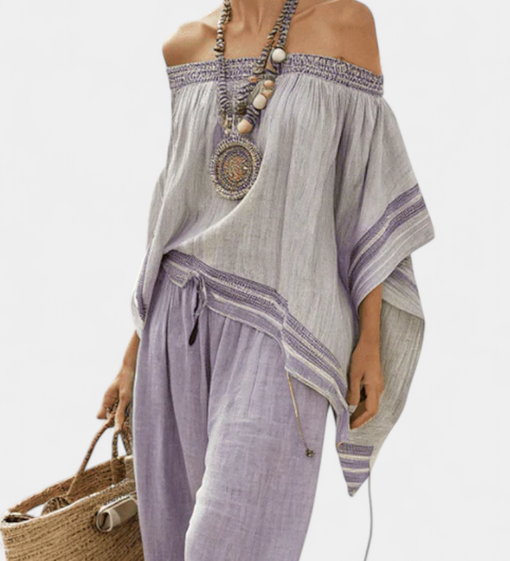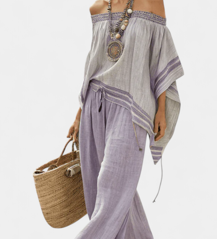 Bambusový top s pruhy, s odhalenými rameny a širokými kalhotami pro elegantní a svěží styl