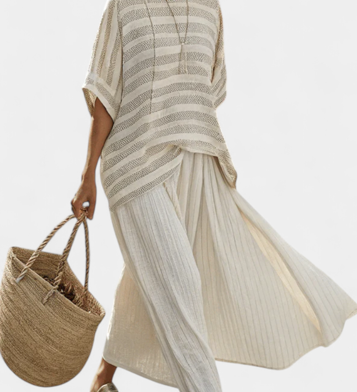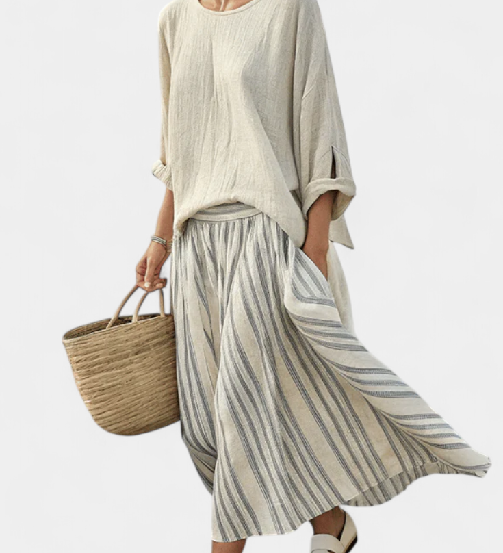 Sada Casual Daisy s Oversize Tričkem a Midi Sukní s Pruhy z Lněného Bambusu pro Elegantní a Pohodlný Styl