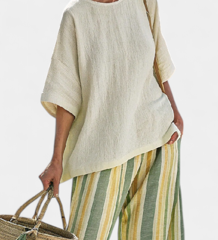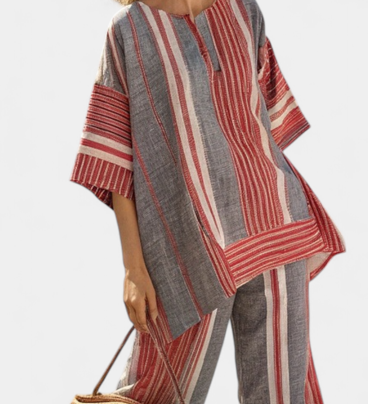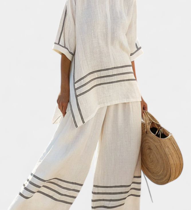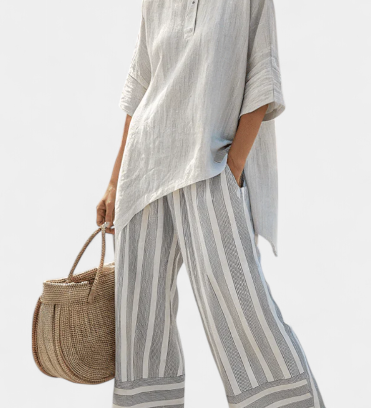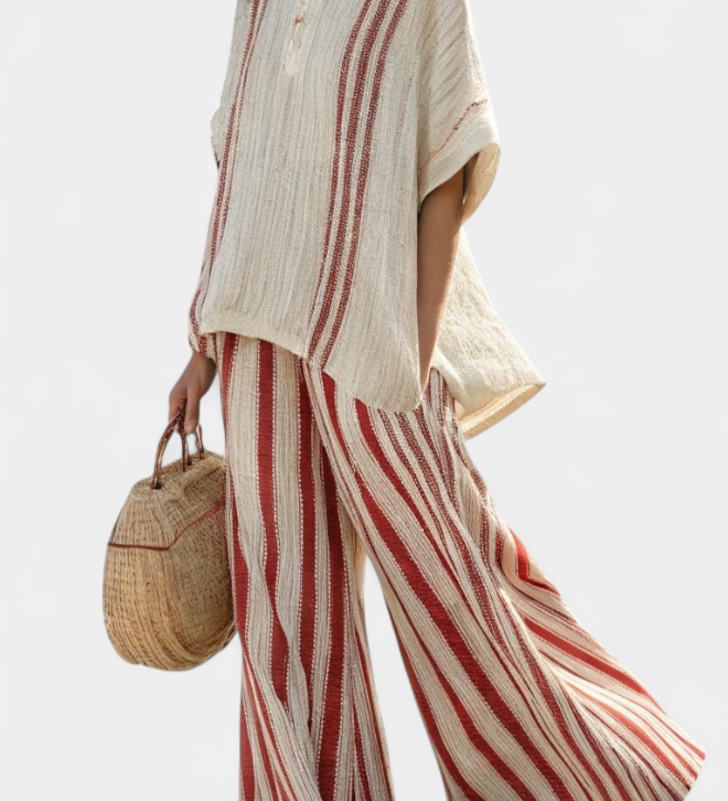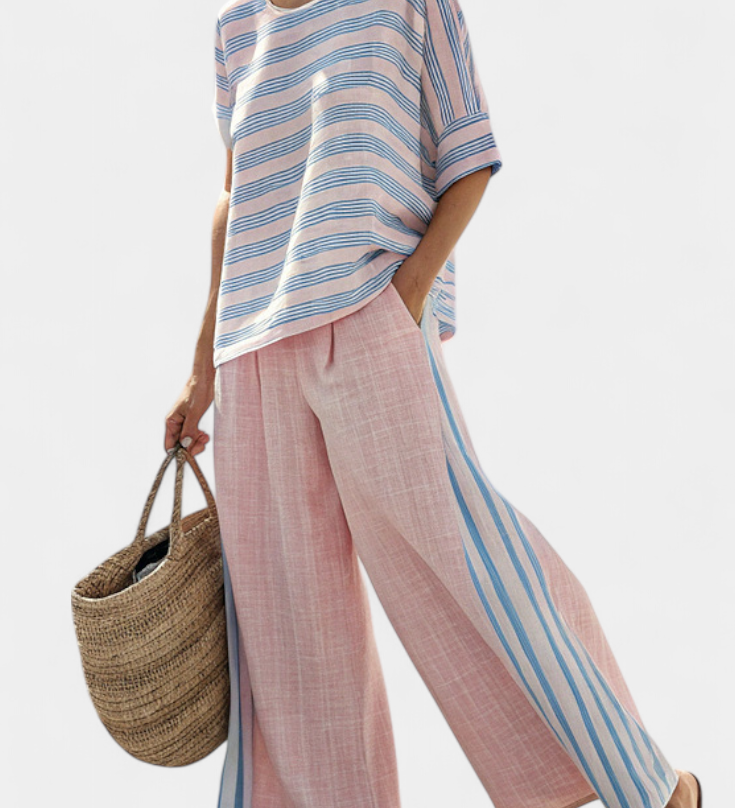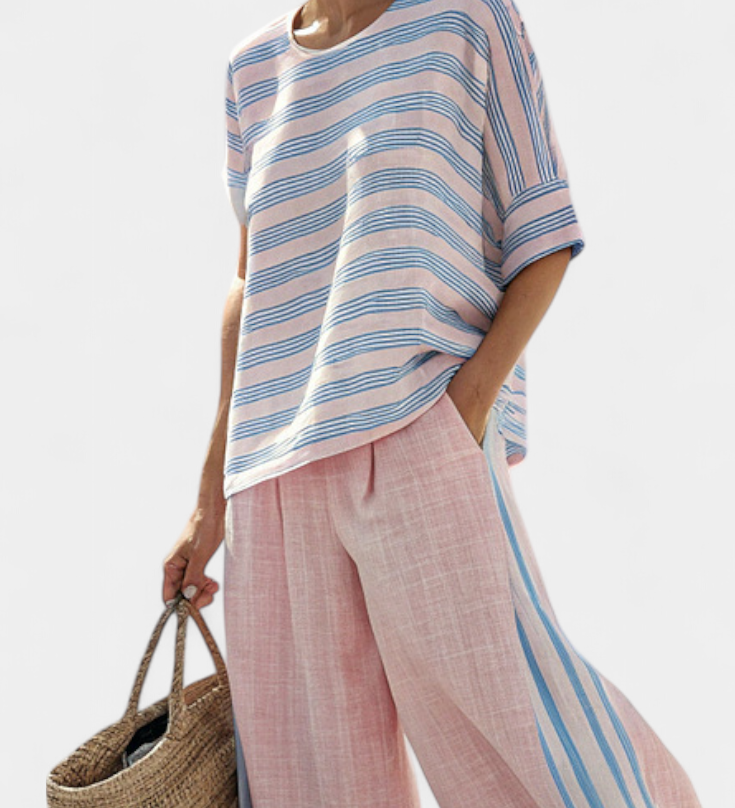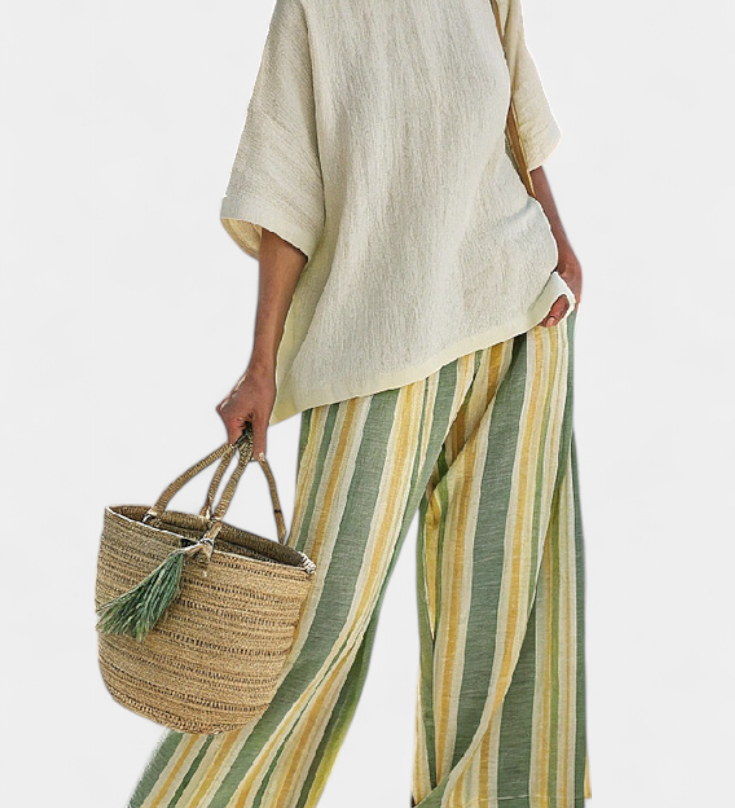 Souprava z bambusového lnu Daisy s elegantním pruhovaným topem a volnými kalhotami pro moderní a pohodlný styl
