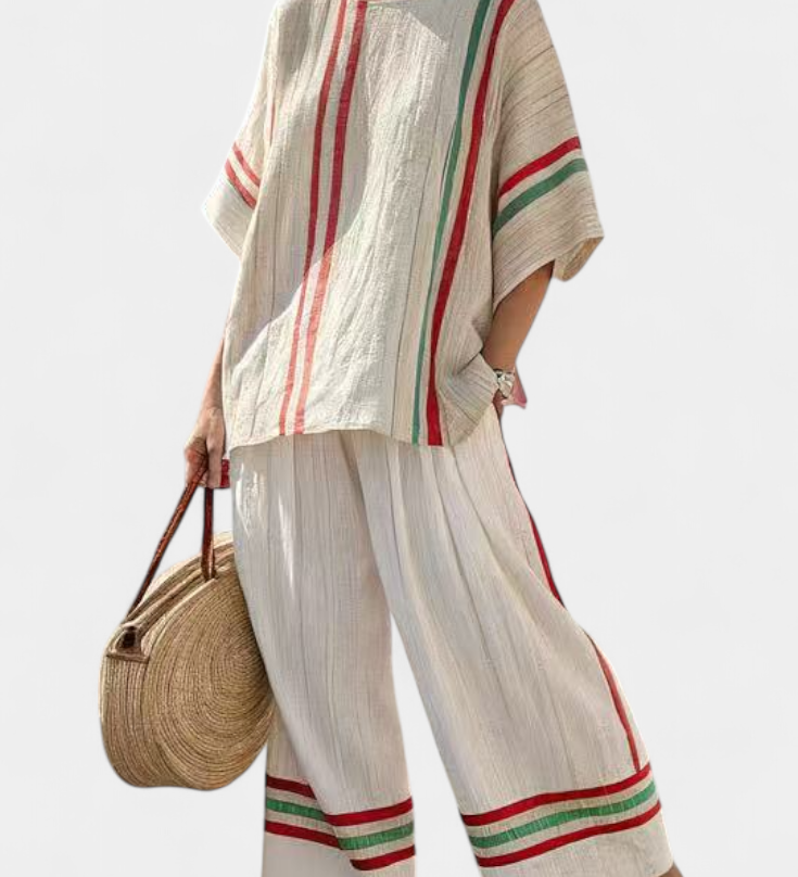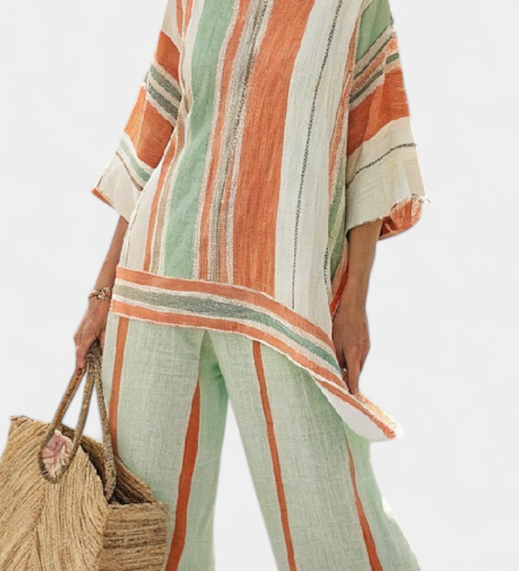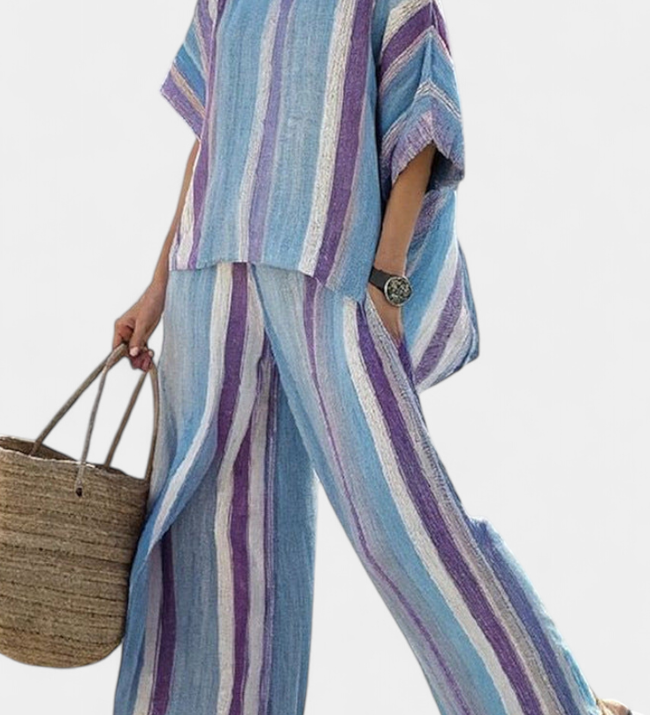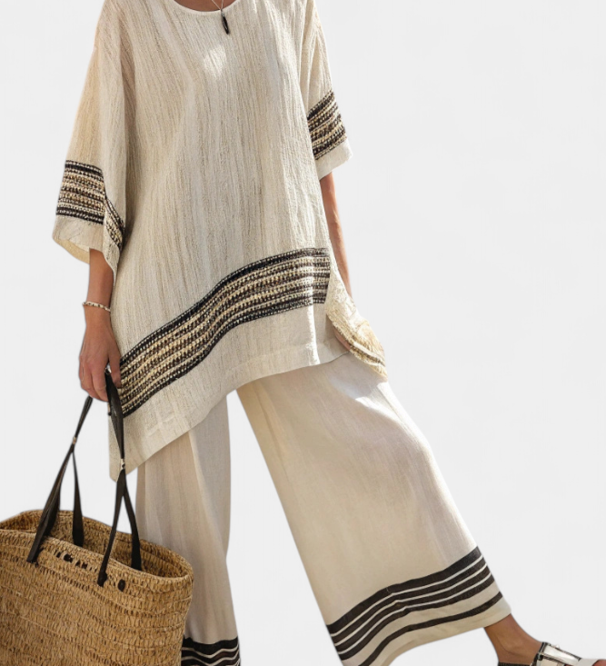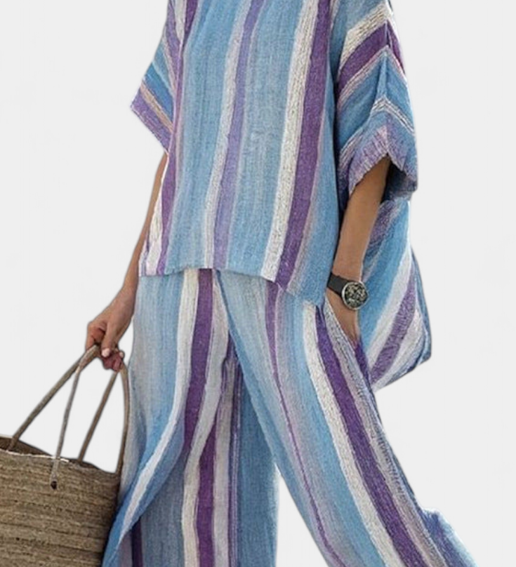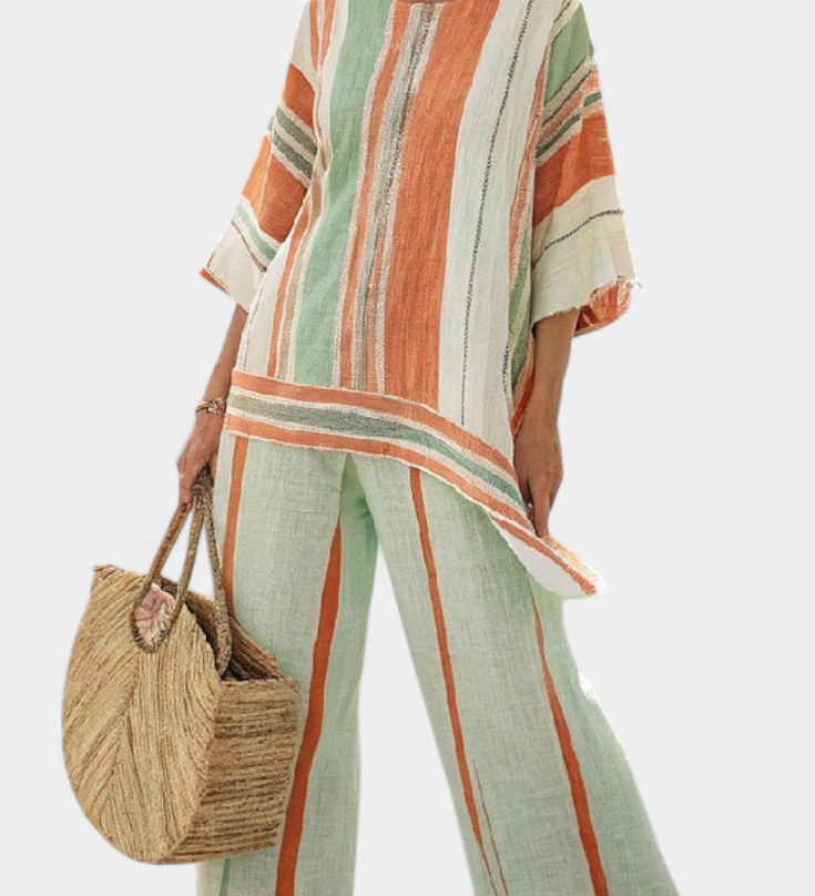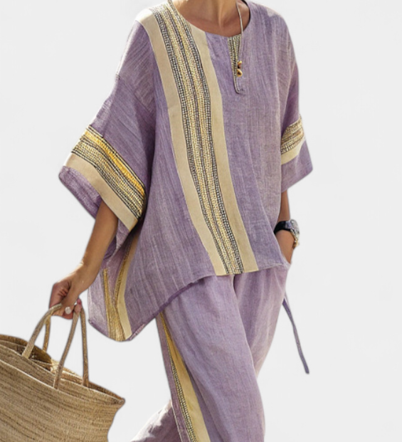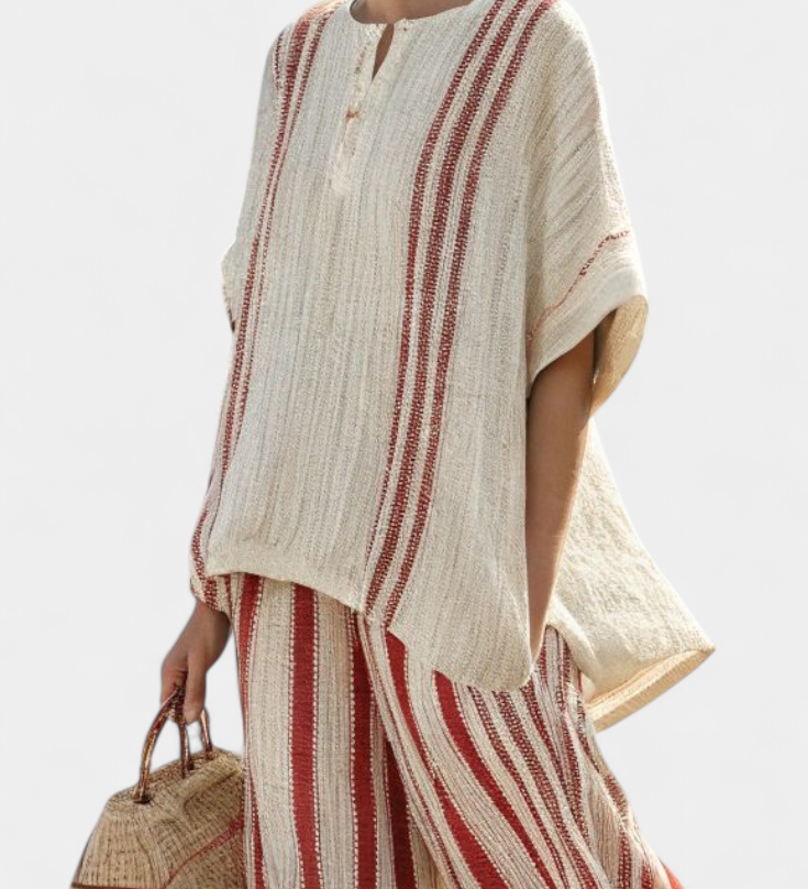 Souprava z bambusového lnu Daisy s elegantním pruhovaným topem a volnými kalhotami pro moderní a pohodlný styl