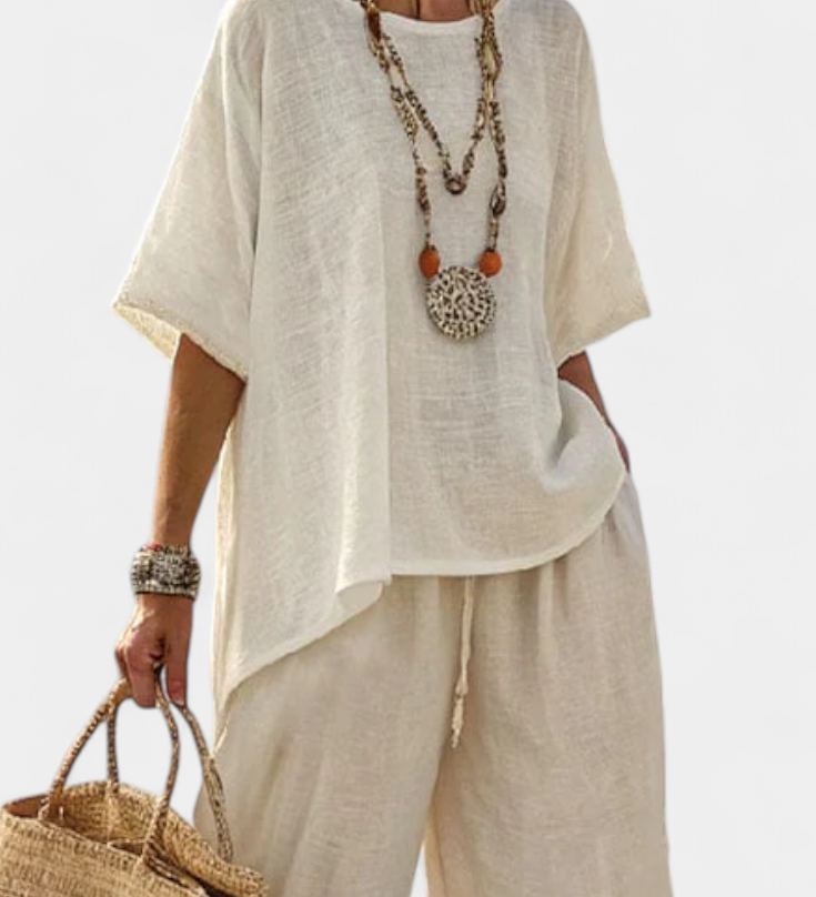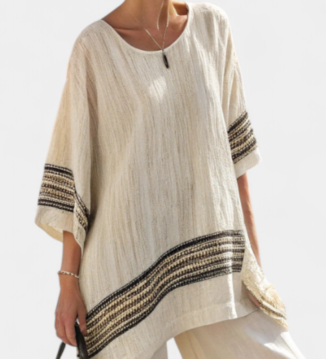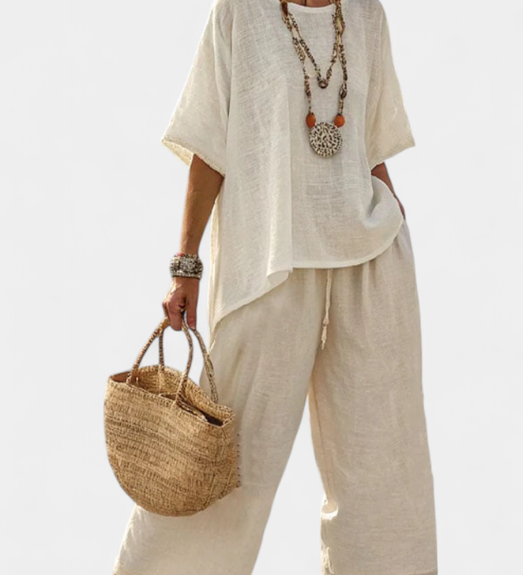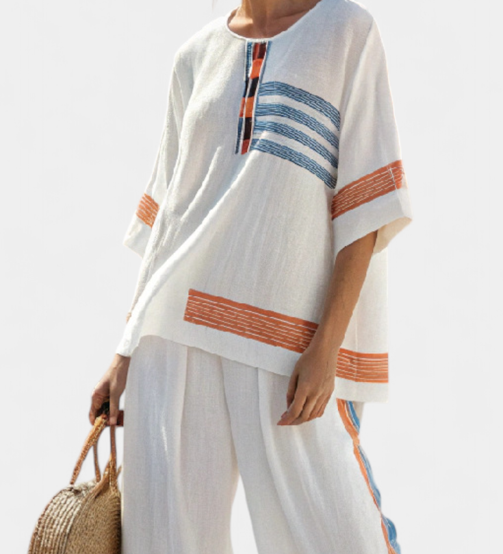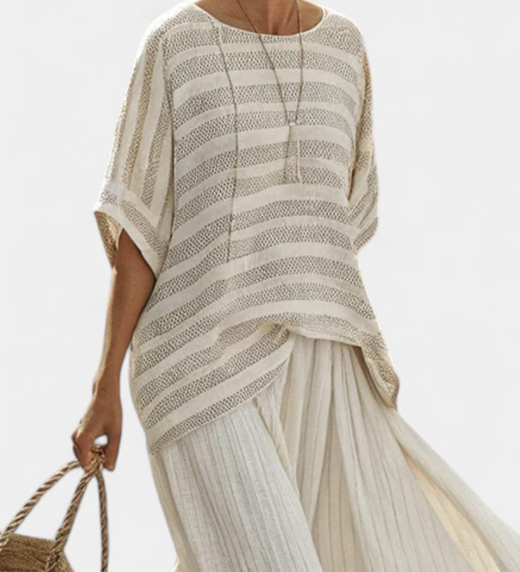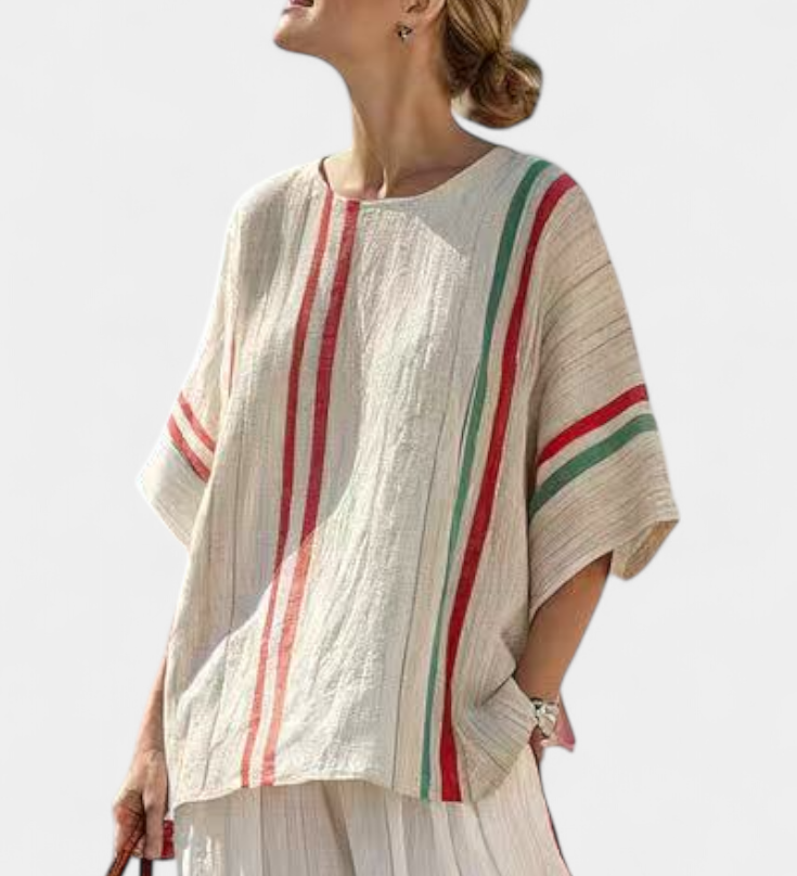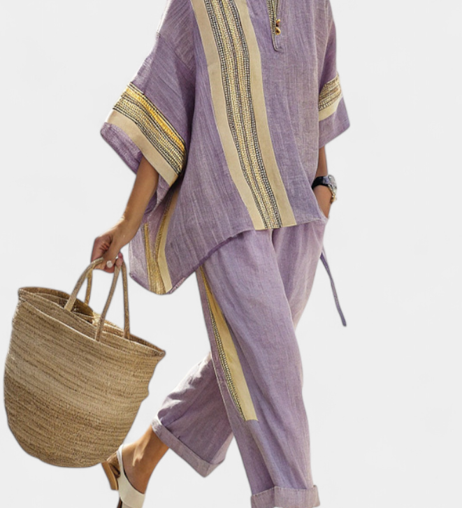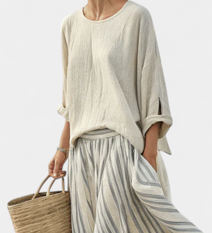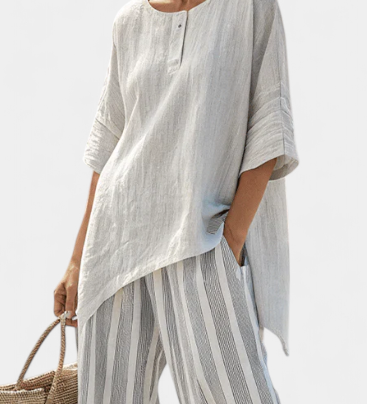 Souprava z bambusového lnu Daisy s elegantním pruhovaným topem a volnými kalhotami pro moderní a pohodlný styl