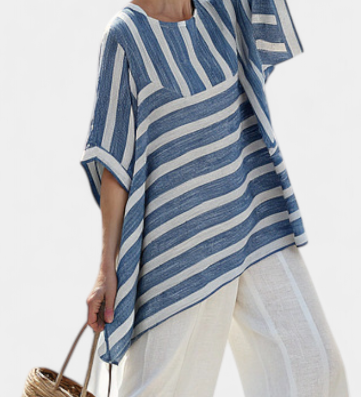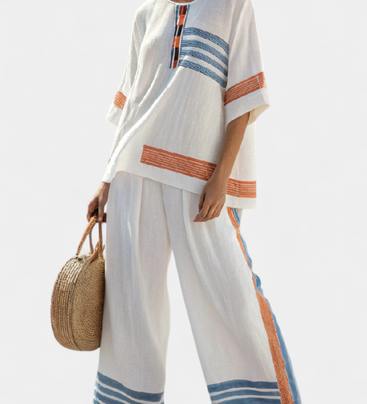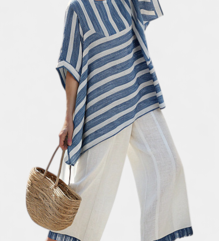 Elegantní Středomořský Set z Lnu s Modrými Pruhy a Kalhoty s Lemováním pro Svěží a Elegantní Vzhled