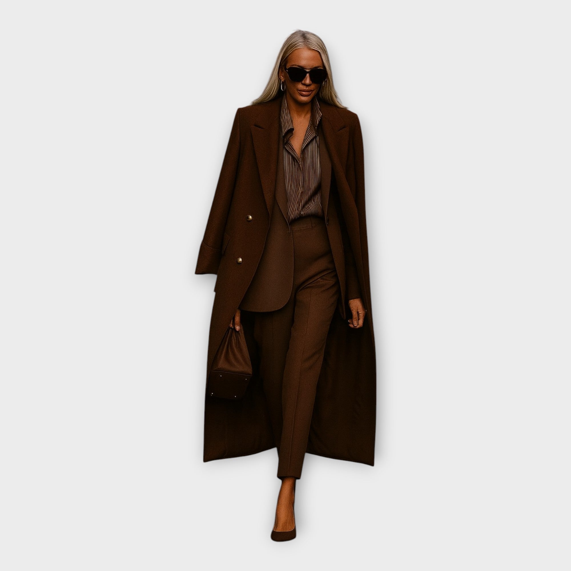 Elegantní souprava s kalhotami a kabátem v minimalistickém stylu