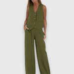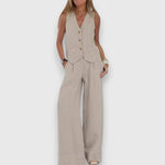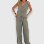 Sada Nina kombinuje letní lehkost s elegantní jednoduchostí – ideální pro horké dny a stylové vzhledy. Bezramenný top v úzkém střihu se setkává s volnými kalhotami, což vytváří moderní, lichotivou siluetu.